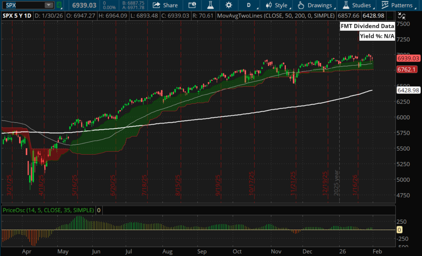 The S&P 500 continued to churn in a tight range near highs, digesting gains rather than extending them. That consolidation survived a full slate of potential catalysts — the FOMC decision, major earnings, political headlines, and a sharp move in commodities — without breaking trend.